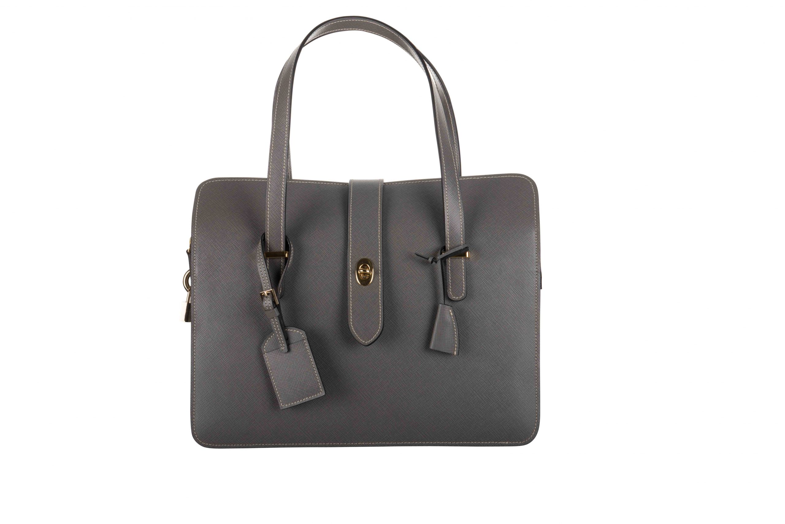 La borsa della foto è stata realizzata in vitello saffiano color grigio, fodera vitello rosso, cuciture ècru, metalli in oro.